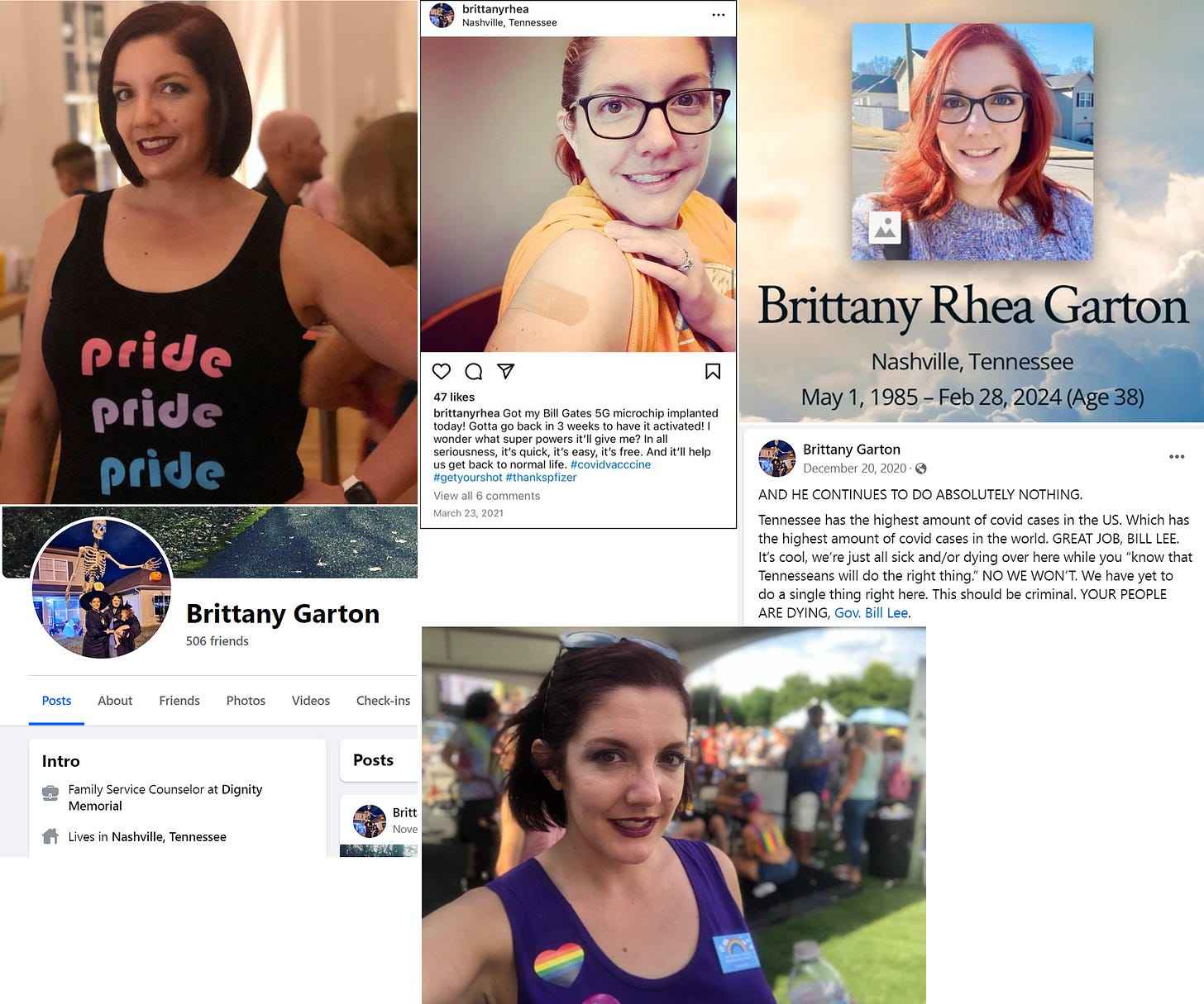 28 feb. 2024 – Nashville, TN – 38-jarige Brittany Rhea Garton plotseling overleden 28 feb. 2024, “orgaanfalen” 23 mrt. 2021: “Vandaag is mijn Bill Gates 5G microchip geïmplanteerd! Moet over 3 weken terug om het te activeren! Ik vraag me af welke superkrachten het me zal geven?” “Bedankt Pfizer”