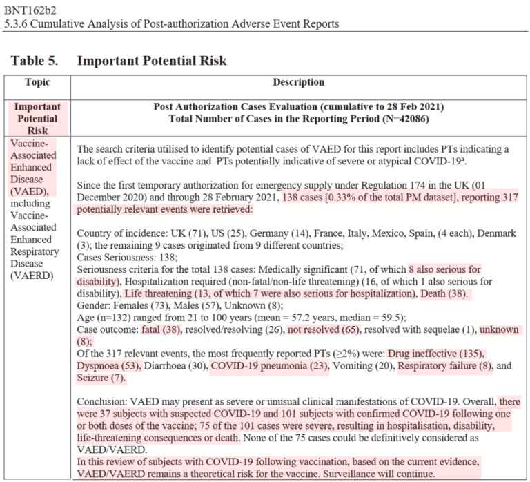 Een van de documenten in de laatste datadump is “reissue_5.3.6 postmarketing experience.pdf“. Tabel 5, te vinden op pagina 11 van het document toont een “Belangrijk Potentieel Risico”, en dat risico wordt vermeld als “Vaccin-Associated Enhanced Disease (VAED), inclusief Vaccin-Associated Enhanced Reporatory Disease (VAERD)”.
