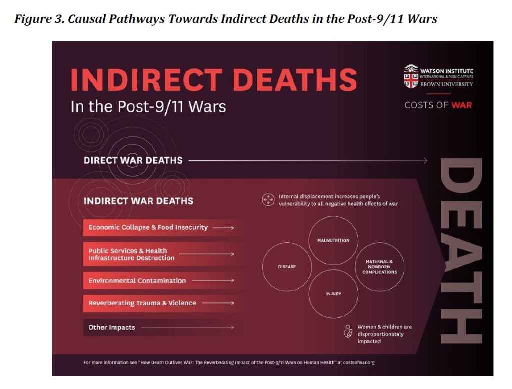 In vrijwel alle oorlogen vormen indirecte doden de meerderheid van de verloren levens. De onderzoekers van Brown University wezen er bijvoorbeeld op: “In conflictgebieden is de kans dat kinderen sterven aan diarree 20 keer groter dan aan het conflict zelf”.