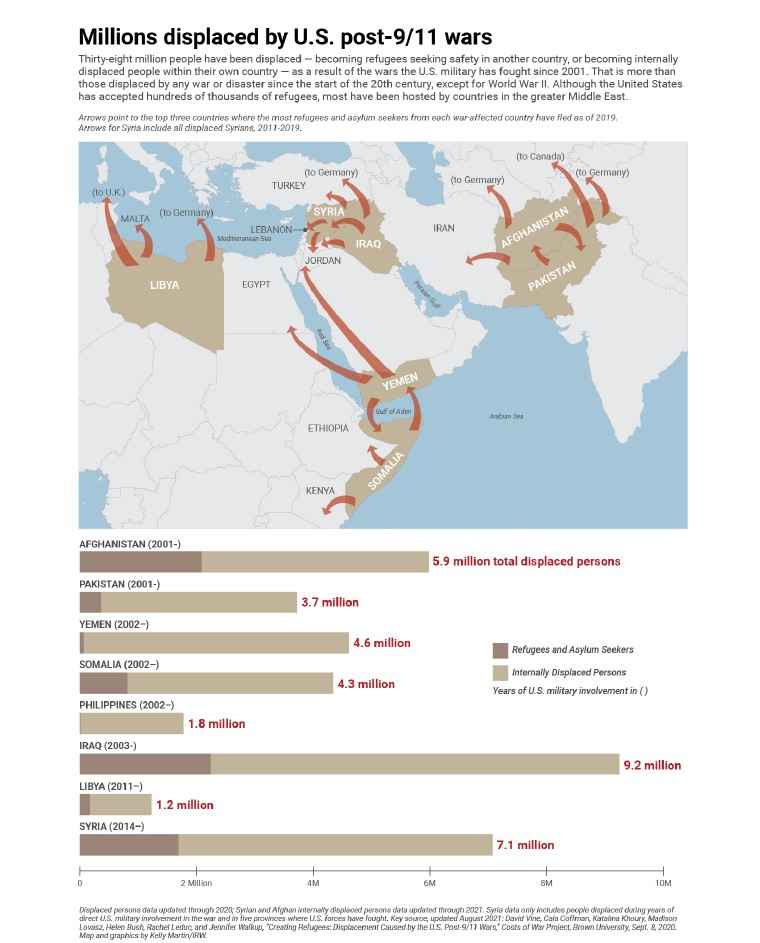 In een afzonderlijke studie uit 2021 stelde het project Cost of Wars van Brown University vast dat de oorlogen van de Verenigde Staten na 9/11 minstens 38 miljoen mensen op de vlucht joegen – meer dan elk ander conflict sinds 1900, de Tweede Wereldoorlog niet meegerekend.