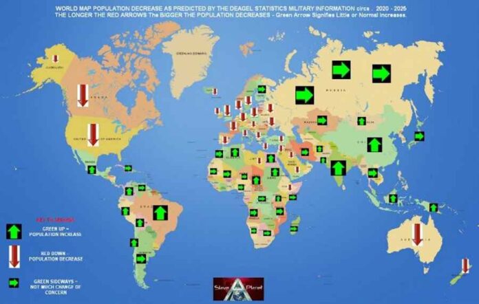 De laatste oorspronkelijke bevolkingsprognose van Deagel.com voor 2025 (voordat hij alles wegveegde) was voor Duitsland 28 miljoen. Voor de VS ziet u hieronder de grafiek die “weggeveegd” is: