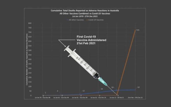 Uit door de Australische Toezichthouder voor Geneesmiddelen gepubliceerde gegevens blijkt dat er in een periode van slechts tien maanden twaalf keer zoveel sterfgevallen zijn gemeld als gevolg van bijwerkingen van de Covid-19-vaccins dan als gevolg van bijwerkingen van alle andere beschikbare vaccins tezamen in een periode van 51 jaar, bericht Dailyexpose.uk.
