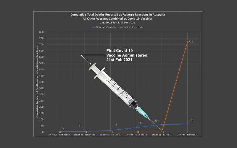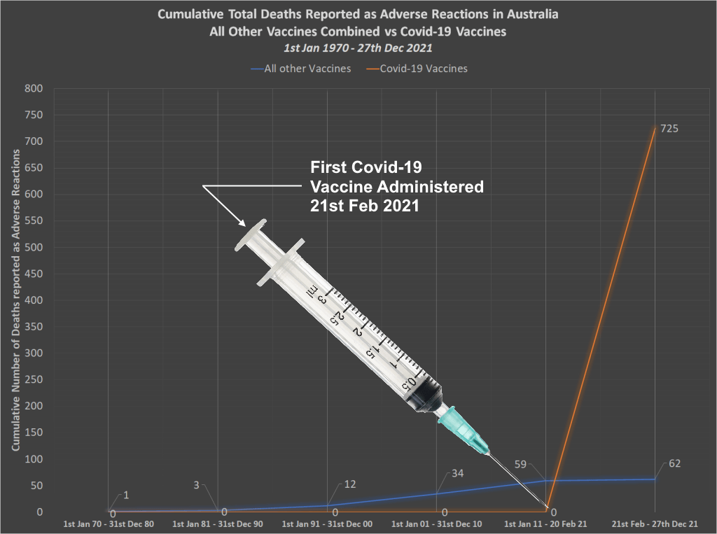 Het eerste Covid-19 vaccin werd in Australië op 21 februari 2021 toegediend. Dit betekent dat er 12 keer meer sterfgevallen, 5 keer meer meldingen van bijwerkingen en 8 keer meer meldingen van bijwerkingen zijn geweest waarvan het TGA vermoedt dat ze meer dan waarschijnlijk te wijten waren aan de Covid-19 vaccins, dan er zijn gemeld voor alle andere beschikbare vaccins samen over een periode van 51 jaar.