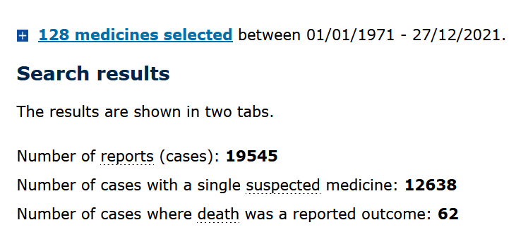 Door in de databank te zoeken op “Vaccin” en de vier beschikbare Covid-19 vaccins te deselecteren, met een datumparameter van “1 januari 1971 – 27 december 2021”, kunnen de volgende resultaten worden gevonden –