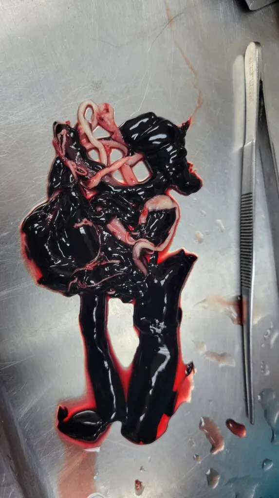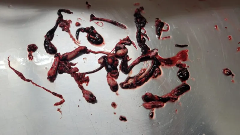 Hirschman stuurde de klonters naar een laboratorium, dat vaststelde dat ze weinig ijzer, kalium en zink bevatten, wat suggereert dat de klonters uit iets anders dan bloed bestonden.