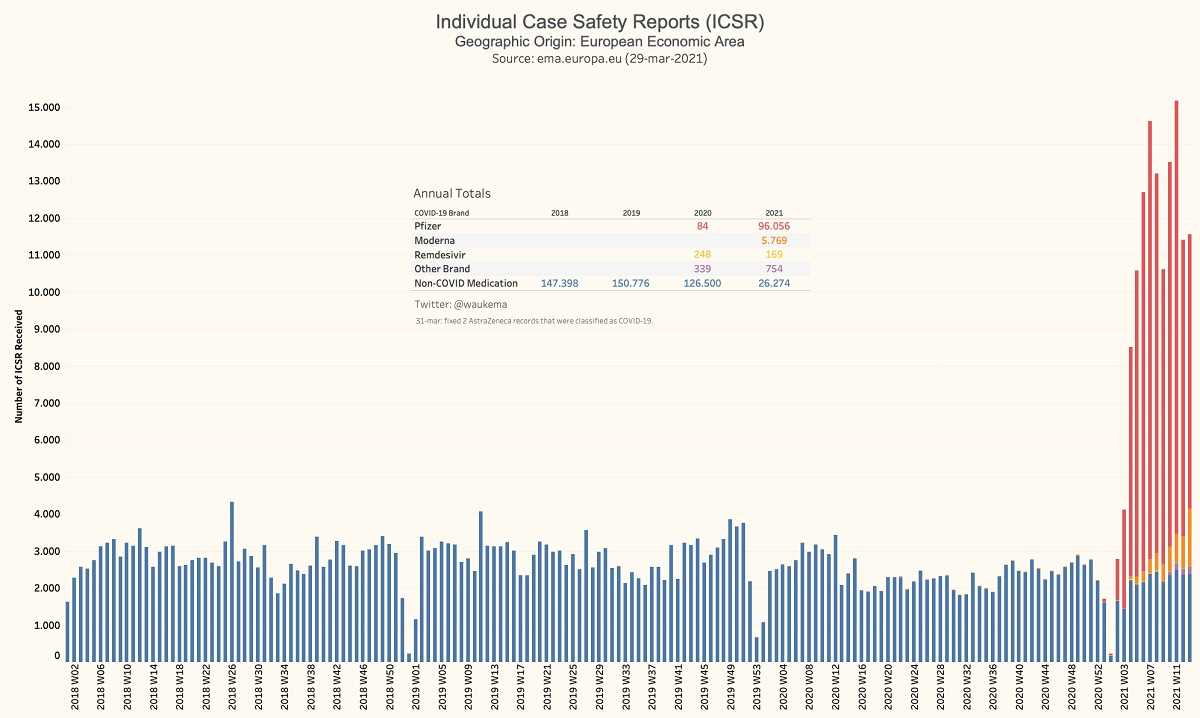 Het Europees Geneesmiddelenbureau (EMA) verzamelt bijwerkingen van geneesmiddelen in een databank, waaronder de experimentele genetisch gemanipuleerde vaccins van Pfizer, Moderna en AstraZeneca. In de geschiedenis van het EMA zijn er nog nooit zulke massale bijwerkingen geweest als nu. Vooral in maart, zijn de gemelde gevallen echt geëxplodeerd.