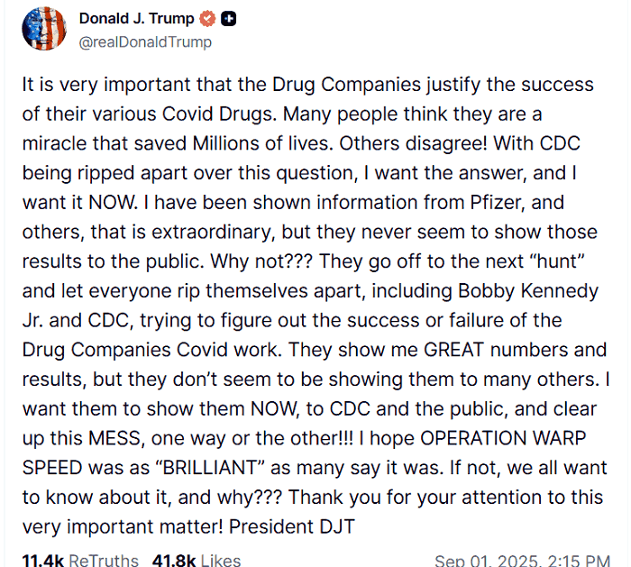 Trump eist nu dat de grote farmaceutische bedrijven de verborgen gegevens onmiddellijk aan het CDC en het Amerikaanse volk overhandigen: