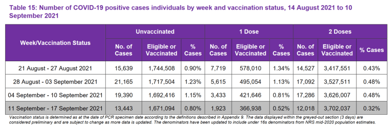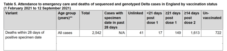 Maar tabel 17 van het laatste verslag laat zien dat dit niet het geval is, aangezien de overgrote meerderheid van de Covid-19 sterfgevallen sinds 14 augustus tot 10 september iedere week voor rekening van de volledig gevaccineerden komt, en onze eerdere analyse van PHS-verslagen laat ook zien dat de overgrote meerderheid van de Covid-19 sterfgevallen al veel langer voor rekening van de volledig gevaccineerden komt (zie hier).