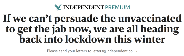 De mainstream media, Public Health bronnen en de regering doen hun best om u ervan te overtuigen dat het de ongevaccineerden zijn die de meerderheid van deze sterfgevallen uitmaken. Een krantenkop in de Independent van deze week beweerde zelfs dat het Engeland deze winter weer in lockdown zou gaan als de ongevaccineerden niet kunnen worden overgehaald om het Covid-19 vaccin te nemen.