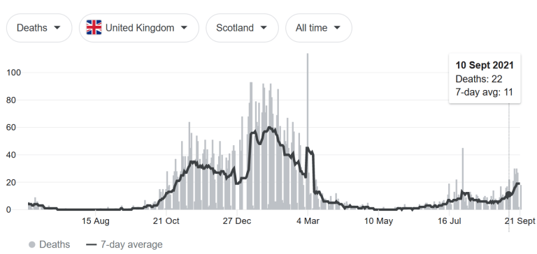 Uit officiële gegevens blijkt dat er tussen 14 augustus 2020 en 12 september 2020 in heel Schotland slechts 7 sterfgevallen door Covid-19 zijn geregistreerd. Maar als we snel doorspoelen naar het heden, blijkt uit de officiële gegevens dat tussen 14 augustus 2021 en 12 september 2021 in heel Schotland 222 sterfgevallen zijn geregistreerd.