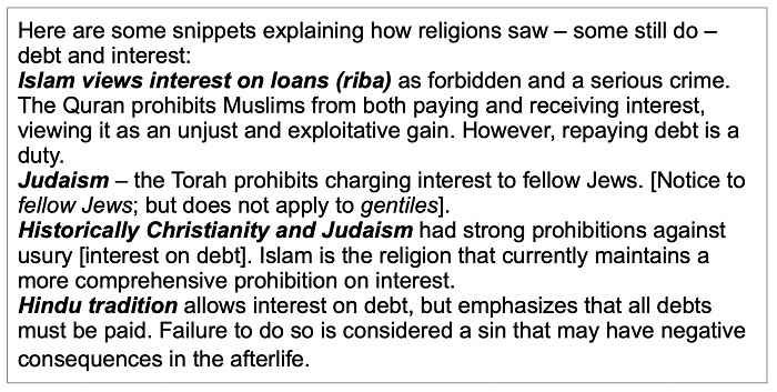 Hier zijn enkele fragmenten die uitleggen hoe religies schuld en rente zagen – en sommigen dat nog steeds doen: