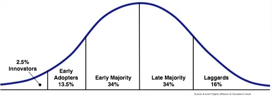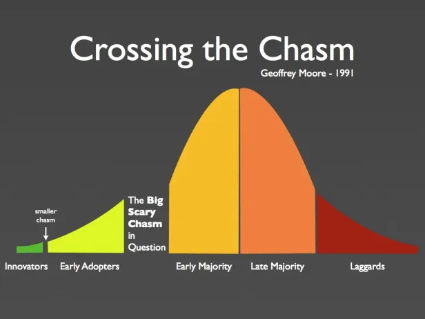 Maar dat artikel bevatte ook Geoffrey Moore’s verfijning van Rogers’ kromme met de “kloof”. 16% adoptie halen is niet genoeg. Het nieuwe ding kan gemakkelijk 16% bereiken door zich simpelweg te verzetten tegen dat wat dominant is. Dit is waar Harari op doelde, dat we alleen maar ab-reageren op het tegenovergestelde van hen, door te zeggen dat we alleen de liberale orde verwerpen maar niets hebben om het door te vervangen.