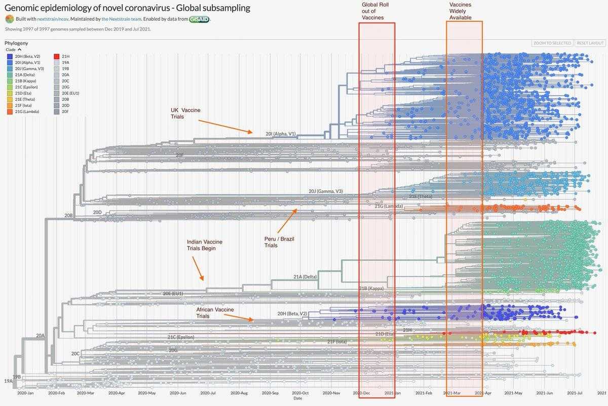 De grafiek getiteld “genomic epidemiology of novel coronavirus” toont de toename van mutaties na de introductie van deze leaky vaccins aan het begin van het jaar.