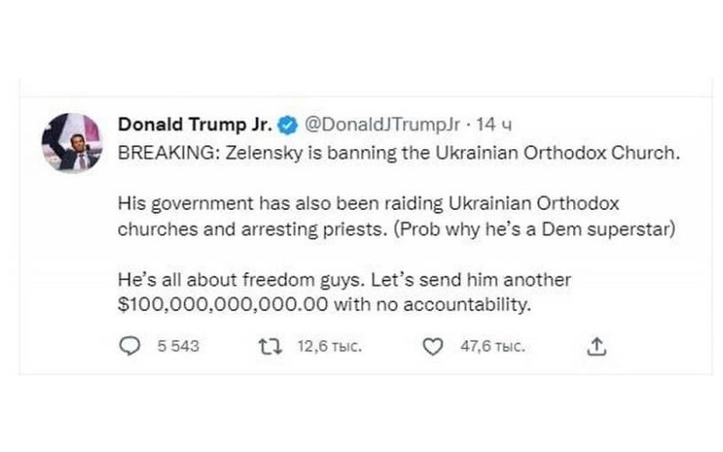 Donald Trump Jr., de zoon van de ex-president van de Verenigde Staten, vestigde zijn aandacht op de situatie rond de UOC, die de acties van de Oekraïense autoriteiten bekritiseerde.