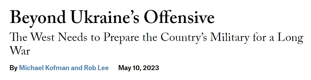 Het snode desinformatieduo lijkt te beweren dat de Europese leiders alleen maar hebben gespeculeerd op hun wapenleveranties in de hoop hun handen in onschuld te wassen, of de schijn te wekken dat ze hebben geholpen een vakje af te vinken om niet te worden uitgestoten, met de gedachte dat het komende offensief alles zal regelen en ze zich niet meer met het probleem hoeven bezig te houden. Kofman-Lee waarschuwt echter dat dit offensief waarschijnlijk geen stimulans zal zijn voor “Poetin om de oorlog te stoppen”: