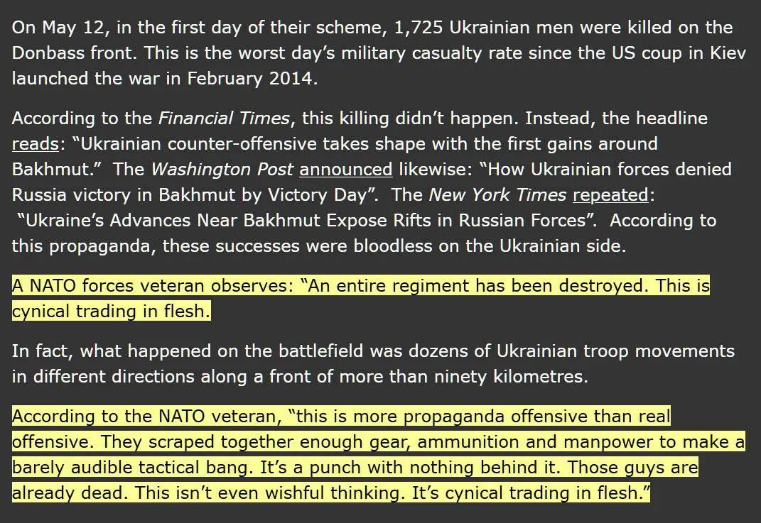 Kortom, hij stelt dat een heel regiment is vernietigd, alleen maar om Zelensky de kans te geven zich in twee minuten op de westerse televisie te verkneukelen dat een onbeduidend hoekje van de flank van Bakhmut voor een paar dagen is “bevrijd”.