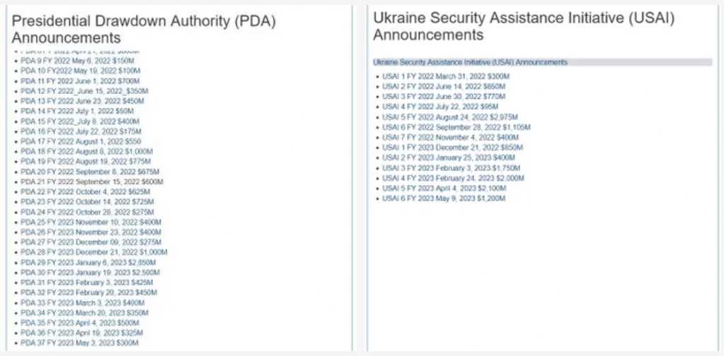 Er vindt een verandering plaats in de aard van de hulp onder de motorkap. Er zijn twee soorten militaire bijstand – PDA en USAI. Bij de eerste worden wapens uit de Amerikaanse militaire voorraden gehaald, bij de tweede gaat het om nieuwe bestellingen. https://comptroller.defense.gov/Budget-Execution/pda_announcements/… https://comptroller.defense.gov/Budget-Execution/USAI_Announcements/
