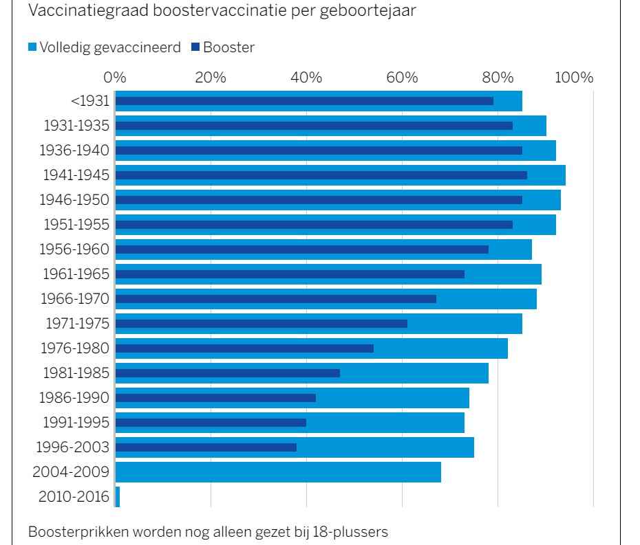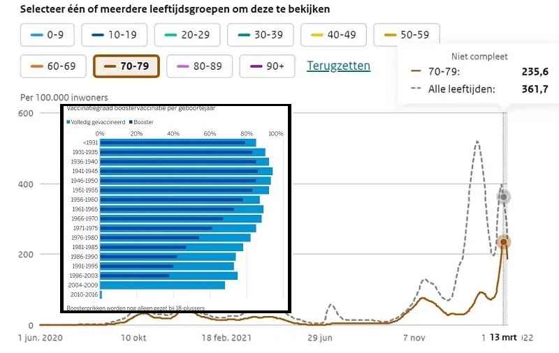 Deze cijfers zijn van februari 2022, u kunt zien dat ongeveer 85% van de mensen van in de zeventig nu drie inentingen heeft gekregen. Vreemd genoeg is het percentage bij de alleroudsten zelfs lager, wat erop wijst dat sommige mensen gewoon te broos en te ziek zijn om deze vaccins te krijgen (wat er dan weer op wijst dat de werkzaamheid van de vaccins nog slechter is dan het lijkt).