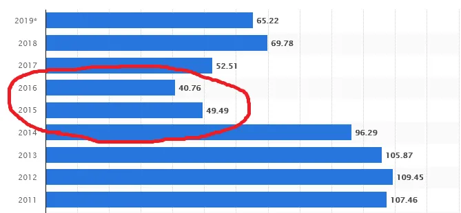 Merk op dat de prijs van 96 dollar in 2014 werd gehalveerd tot 40-49 dollar in 2015-2016.
