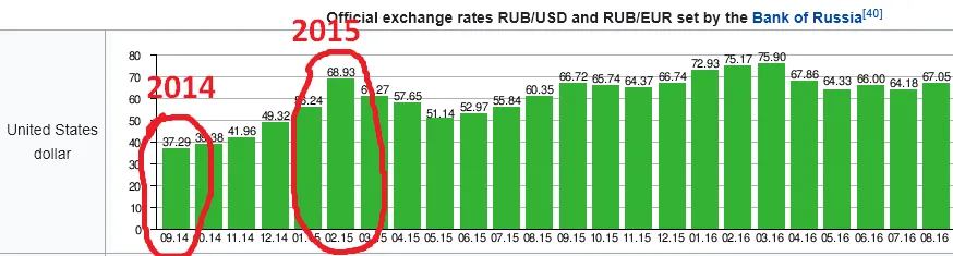 Wonderbaarlijk genoeg komt de devaluatie overeen met de exacte tijdlijn en ernst van de oliecrash – de olie daalde met de helft van ruwweg ~100 dollar naar ~50 dollar en de roebel devalueerde ook met “de helft”, want hij ging van ~35 naar ~70 ten opzichte van de dollar in 2015-2016.