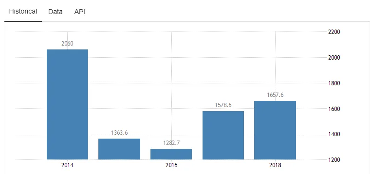 Zoals blijkt uit onderstaande grafiek, bedroeg het Russische BBP volgens deze bron 2.060 miljard dollar in 2014, en was het in 2016 als bij toverslag teruggebracht tot 1.282 miljard dollar. Dit betekent een daling van ongeveer ~40% in lijn met de crash van de roebel.
