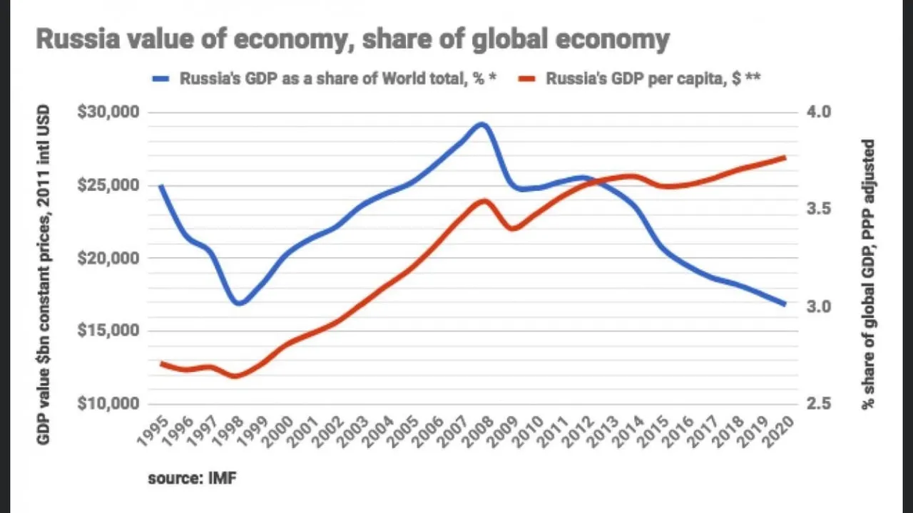 Het Russische BBP bleek te devalueren van ~2 biljoen naar 1,2 biljoen bijna “van de ene op de andere dag”, alleen vanuit het valse perspectief van de “nominale BBP-grafiek”, die niet de juiste manier is om een economie met handelsoverschotten te bekijken, omdat de “nominale BBP-lijst” alleen in dollars wordt geprijsd, en daarom de realiteit van dergelijke economieën sterk vertekent.