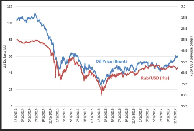 Kijk nu heel zorgvuldig naar de onderstaande grafiek, en u begint de magie te zien. Zoals u kunt zien, ging op precies hetzelfde moment de omrekeningskoers van de roebel naar de dollar van een dieptepunt van ongeveer ~37 roebel naar 1 dollar in 2014, en steeg deze koers tot ~60-75 roebel naar 1 dollar in het volgende jaar, precies samenvallend met de crash van de olieprijs.