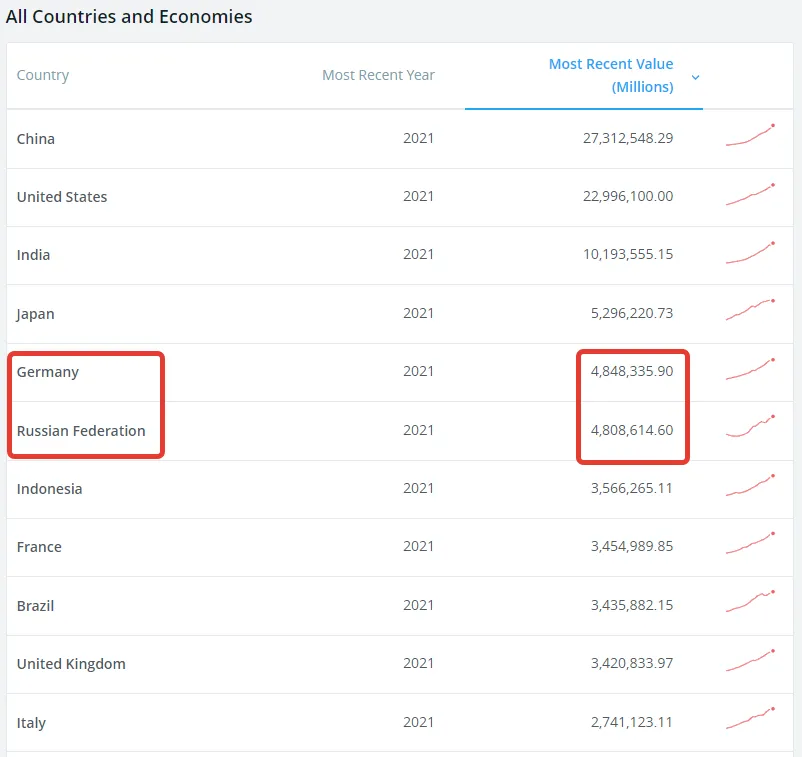 De laatste cijfers van de Wereldbank die ik momenteel kon vinden, van hun officiële site, tonen Duitsland en Rusland nek aan nek voor 2021: