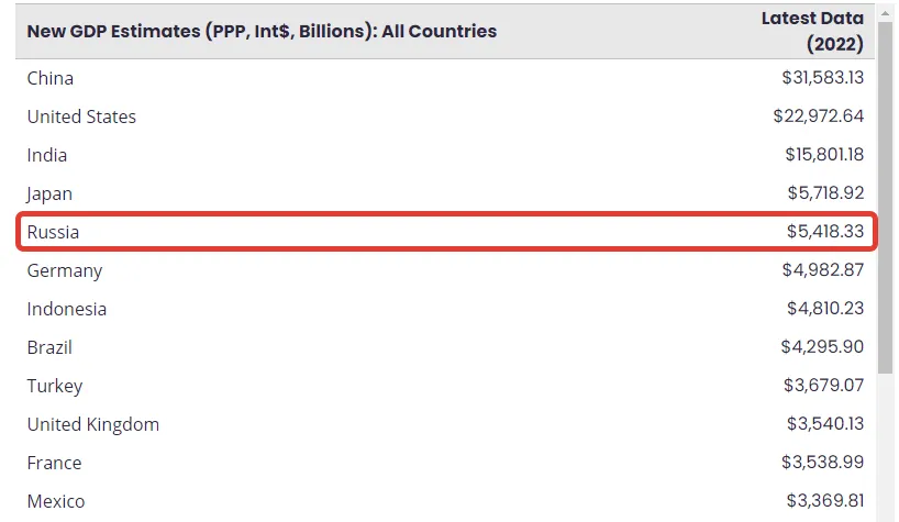 Ten tijde van het schrijven van het oorspronkelijke artikel had Rusland volgens sommige bronnen zoals het IMF zelfs Duitsland ingehaald in de PPP-index van het BBP.