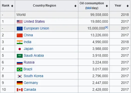 Sommigen zijn misschien niet overtuigd, totdat ze naar de bovenstaande grafiek kijken en zien hoe goed deze correleert met de typische stand van het BBP. De grafiek toont het olieverbruik per land en in feite lijkt de top 10 allemaal sterk op de PPP BBP-grafiek.
