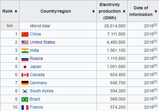 Zoals u hier kunt zien, komen de cijfers ook overeen met de PPP-cijfers van het BBP. Dezelfde landen die de top 10-economieën domineren, produceren of verbruiken elektriciteit in percentages die correleren met hun economische macht. Niet toevallig staat Rusland ook hier in de buurt van de top 5, net als bij het BBP/KKP.