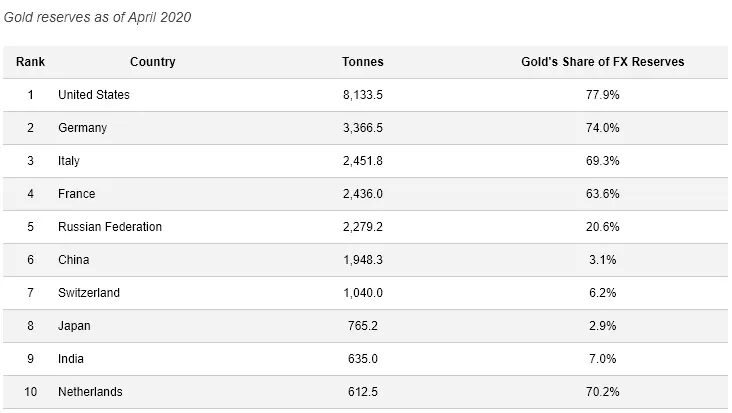 Een andere indicator die we kunnen gebruiken is de totale goudreserve. Deze cijfers weerspiegelen ook de economische macht, aangezien alleen de economisch sterkste landen in de top 10 voorkomen, ongeveer in dezelfde samenstelling als hun officiële BBP. Goud is al lang een verklikker voor de macht, het prestige en de economische status van een land. In de onderstaande grafiek zien we opnieuw dat Rusland op bijna dezelfde plaats staat als in de andere grafieken hierboven.