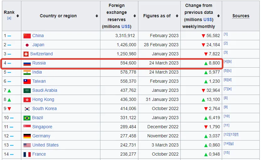 En hoe zit het met de deviezenreserves, een duidelijk teken van de gezondheid en vitaliteit van de economie van een ontwikkeld land. Dit is precies het fonds dat het Westen probeerde af te pakken van Rusland, maar zoals ik in eerdere artikelen heb uiteengezet, zijn ze daar niet in geslaagd op de manier die ons werd voorgehouden. Nogmaals, de toppositie van Rusland komt overeen met zijn economische positie: