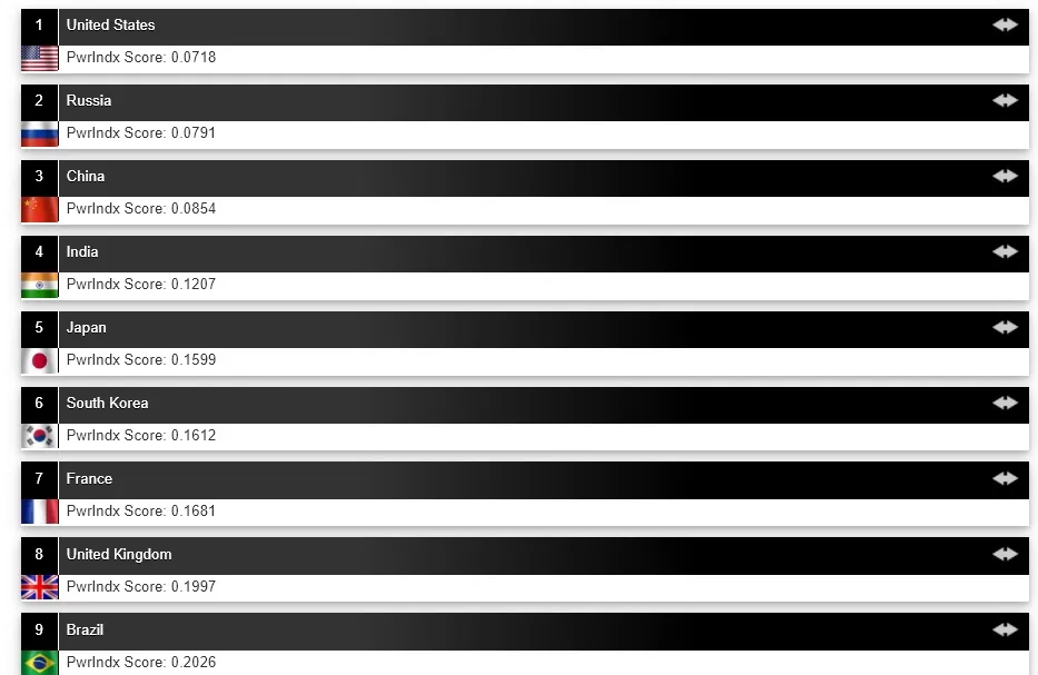 Natuurlijk kunnen we veel andere indicatoren gebruiken, bijvoorbeeld de wereldwijde militaire positie. Het is algemeen aanvaard dat Rusland op zijn minst de op één na machtigste militaire macht op aarde is, en de militaire posities komen ongeveer overeen met de economische posities van dezelfde landen – met de bekende gezichten van de VS, Rusland, China, India, Japan, enz. aan de top van de lijst.