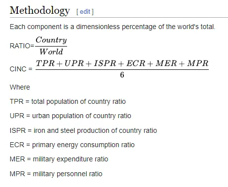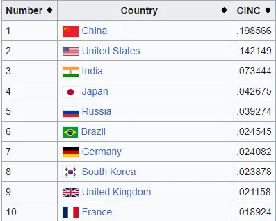 En het interessantste van allemaal is dat er zelfs een indicator bestaat die speciaal voor dit soort meta-economische analyses is gemaakt. De samengestelde index van nationaal vermogen is een “statistische maatstaf van nationale macht” die zijn lijst ontleent aan de meting van verschillende componenten zoals demografie, economische kracht, militaire macht, enz. en deze door een formule haalt. Het is niet verrassend dat het algoritme ook gebruik maakt van energieverbruik: