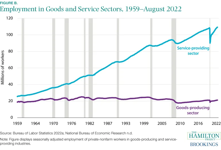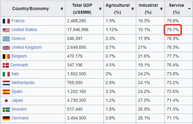 Een van de redenen hiervoor is dat de VS voornamelijk een diensteneconomie is. Zoals het Brookings Institute ons vertelt, werken vandaag vier op de vijf Amerikanen in de dienstensector: