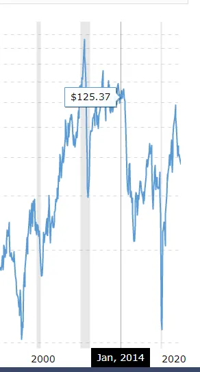 Laten we eerst het eerste punt bewijzen. Rond 2014 lag de olieprijs gestaag tussen 100 en 130 dollar per vat, zoals blijkt uit onderstaande grafiek.