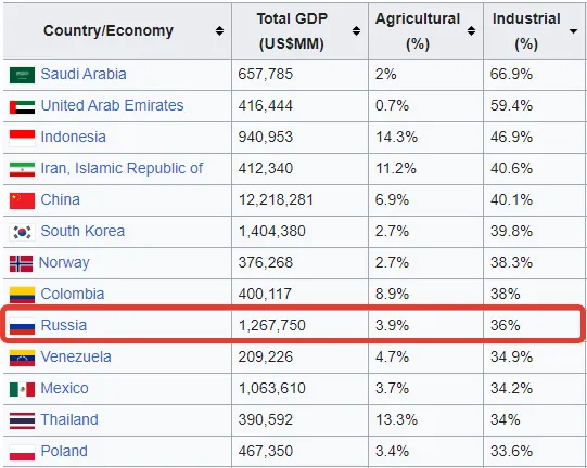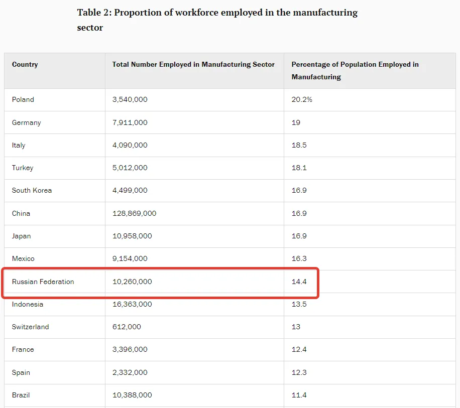 Hier staat Rusland op een respectabele 9e plaats met 36%. De VS staat op een trieste #33e plaats met ~19% van de economie in de industriële sector. Ook bij een herschikking naar landbouw komt Rusland met bijna 4% en de VS met 1,1%. En ook het totale percentage mensen dat werkzaam is in de verwerkende industrie is in Rusland met 14,4% een van de hoogste ter wereld: