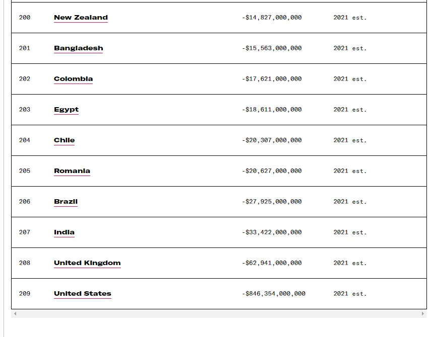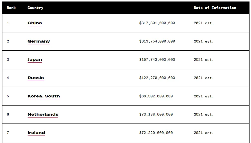 Rusland daarentegen behoort tot de toonaangevende landen met een overschot op de lopende rekening. Hier is de officiële CIA Factbook-lijst uit 2021: