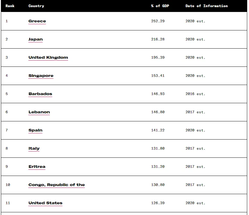 En laten we, opnieuw met behulp van het CIA Factbook, de schuldquote per land bekijken. Hier staan de VS op de 11e plaats met 126% schuld/BBP.