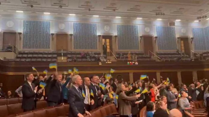 Democraten in het Huis zwaaiden met Oekraïense vlaggen en juichten “Ukraine First” toen de stemming over de enorme hulp aan Oekraïne werd afgesloten, schrijft Thepeoplesvoice.