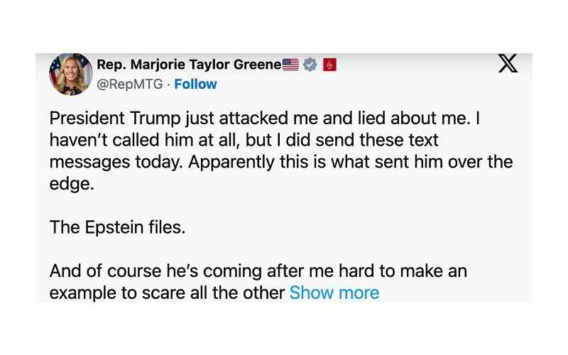 Trump’s poging om de Epstein-affaire te begraven als een hoax van de Democraten is gewoon een voortzetting van zijn Israel First-beleid, dat de MAGA-achterban verscheurt. Het uitschelden van MTG, die in het verleden een trouwe aanhanger van Trump was, voegt alleen maar olie op het vuur van de woede die zich verspreidt onder veel MAGA-aanhangers die zich door Trump verraden voelen. Trump’s bombast komt hem duur te staan… Hij is te trots en te narcistisch om toe te geven dat hij ongelijk heeft en om vergeving te vragen.