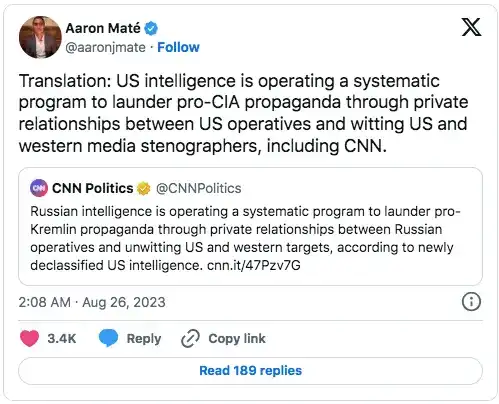 Ten derde, en gerelateerd aan het tweede punt, waarom publiceert CNN een persbericht van de CIA en vermomt het als een nieuwsbericht? “Amerikaanse inlichtingendiensten geloven dat Rusland duistere praktijken uithaalt” is geen nieuwsbericht. Het is niet de taak van een journalist om te melden hoe het kartel van de Amerikaanse inlichtingendiensten over dingen denkt, het is de taak van een journalist om harde feiten te melden op basis van harde bewijzen. Dat is wat nieuwsverslaggeving is. Zeggen dat het Amerikaanse inlichtingenkartel vindt dat we meer paranoïde en achterdochtig moeten zijn over zeer subtiele Russische invloed die verborgen wordt gehouden door lagen van schijnbaar onafhankelijke actoren en mensen die niet weten dat ze eigenlijk Russische spreekbuizen zijn, is gewoon staatspropaganda publiceren.