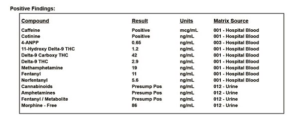 Dit is het Hennepin County autopsierapport, waarin de doodsoorzaak wordt vermeld als “cardiopulmonale arrestatie die de wetshandhaving bemoeilijkt in een subduraal stadium, in bedwang houden en nekcompressie”. Er staat niet “wurging”. Er staat ook dat Floyd een “arteriosclerotische hartaandoening” had, die “multifocaal, ernstig” was, en dat hij een “hypertensieve hartaandoening” had, en dat hij Covid-19 positief was. De toxicologische rapporten zeggen dat hij Fentanyl, Norfentanyl, Methamphetamine, Morfine, en verschillende vormen van THC (het bedwelmende middel in marihuana) in zijn lichaam had. U kunt de volledige lijst hieronder zien. De belangrijkste bevinding is Fentanyl, dat Floyd had met 11ng/mL. Later in het toxicologisch rapport vinden we deze cruciale zin: “Tekenen die verband houden met fentanyl toxiciteit zijn onder andere ernstige ademhalingsdepressie, aanvallen, hypotensie, coma en de dood. Bij sterfgevallen door fentanyl zijn de bloedconcentraties variabel en zijn er meldingen van slechts 3 ng/mL”. Floyd had meer dan drie keer de potentieel dodelijke dosis fentanyl in zijn lichaam voordat de politie zelfs maar kwam opdagen.