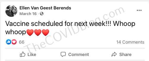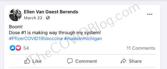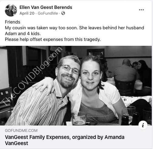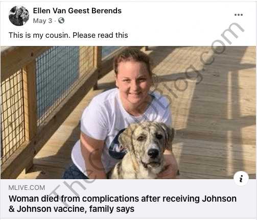 Mevrouw Berends Facebook naam is “Ellen Van Geest Berends.” Het deed me onmiddellijk denken aan Anne Van Geest, de 35-jarige die 11 dagen na haar Johnson & Johnson virale vector DNA-injectie in april overleed. Anne kwam toevallig ook uit Michigan. De puntjes sloten uiteindelijk op elkaar aan.