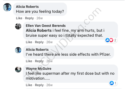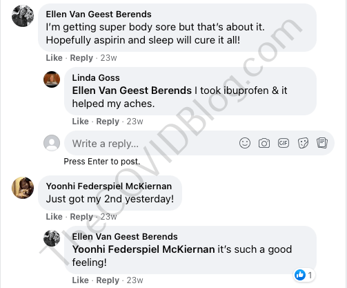 Mevrouw Berends kreeg haar tweede Pfizer mRNA injectie op 12 april. Ze meldde dat ze “superveel spierpijn” had, maar zei ook dat het “zo’n goed gevoel” was.
