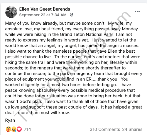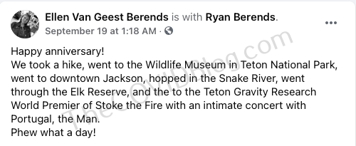 Ze ging verder met haar gewone leven. Mevrouw Berends meldde op 19 september dat zij en haar man in het Grand Teton National Park in Wyoming waren. Ze plaatste verschillende foto’s bij de update. Die dag of week was blijkbaar hun 28e huwelijksverjaardag.