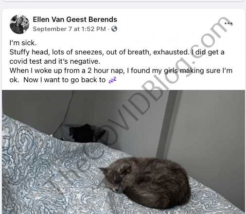 Mevrouw Berends meldde dat zij zich op 7 september “ziek” voelde. Ze had last van een drukkend hoofd, niezen, kortademigheid en vermoeidheid. Een “COVID-19”-test was negatief.