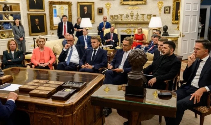 De foto die het Witte Huis vorige week publiceerde, met Donald Trump achter zijn bureau en de Europese leiders op stoelen voor hem, laat zien hoe de poging tot opstand van de Europese volgelingen is geëindigd. De politici zitten ongemakkelijk op hun stoelen en zien eruit als onhandelbare schoolkinderen die op het matje zijn geroepen. Alexander Stubb, de Finse president, maakt aantekeningen als een leerling die gretig noteert wat de directeur zegt. Giorgia Meloni, de Italiaanse premier, stond met gekruiste armen en keek alsof ze strafwerk had gekregen. Friedrich Merz en Emmanuel Macron probeerden belangrijk te lijken – als de klassenvertegenwoordigers. Van Trump is alleen zijn vuist te zien.