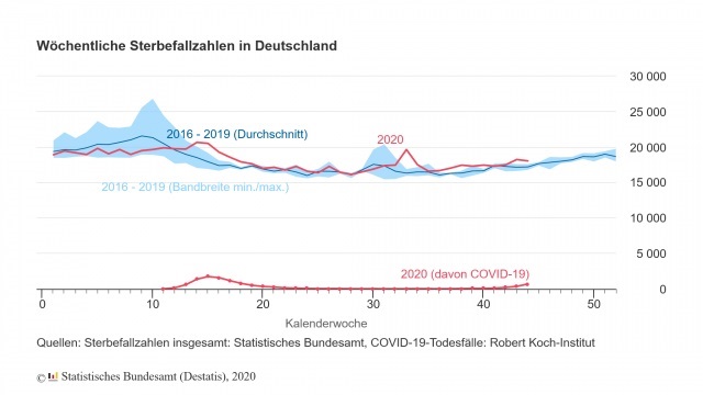 Op basis van voorlopige gegevens heeft het Federaal Bureau voor de Statistiek in 2020 tot en met 31 oktober 788.332 sterfgevallen geregistreerd. Dit cijfer ligt dus exact tussen de cijfers voor 2018 (777.813) en 2019 (799.113) en slechts iets boven het gemiddelde van de afgelopen vier jaar. Dit cijfer bedraagt 775.526 doden tot eind oktober. Het verschil is ruwweg het aantal sterfgevallen in één week.